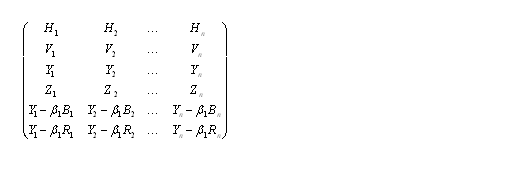 現行的彩色電視系統中,由行向量H,幀向量V,亮度向量Y組成的,表達彩色信息的是由紅向量R,綠向量G,蘭向量B的三維線性空間。也可用以下的矩陣來表示: