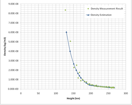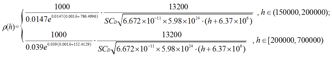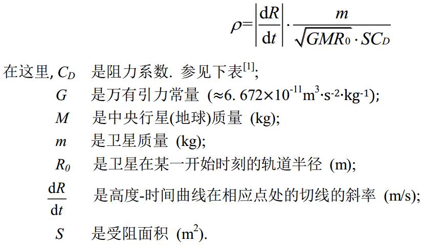 這種模式是否具有實(shí)用意義主要取決于離子在工作環(huán)境中是否充足, 即是說, 我們首先必須先測(cè)出高層大氣的近似的密度. 又因?yàn)樗? 無(wú)法直接測(cè)量, 我就想出一種間接的方法: 通過測(cè)量不受控制的近地軌道衛(wèi)星的軌道高度的自然衰減. 由于密度可由作用于衛(wèi)星上的大氣阻力大小求出, 這個(gè)阻力間接地體現(xiàn)在衛(wèi)星高度衰減上, 因此通過計(jì)算我們得出密度ρ (kg/m3 ):
