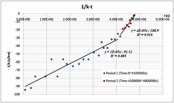 于是, 通過密集地在曲線上取點(diǎn)然后通過Excel軟件錄入并處理其t和 h坐標(biāo), 我們可以近似得到曲線在相應(yīng)點(diǎn)上的切線斜率k. 進(jìn)一步地, 通過建立k和1/t之間的線性回歸模型, 我們可以解決出A和B. 并通過求估計(jì)高度與實(shí)際高度的差的平均值, 我們可以得C. 綜上我們可以得到以下的密度-高度模型:
