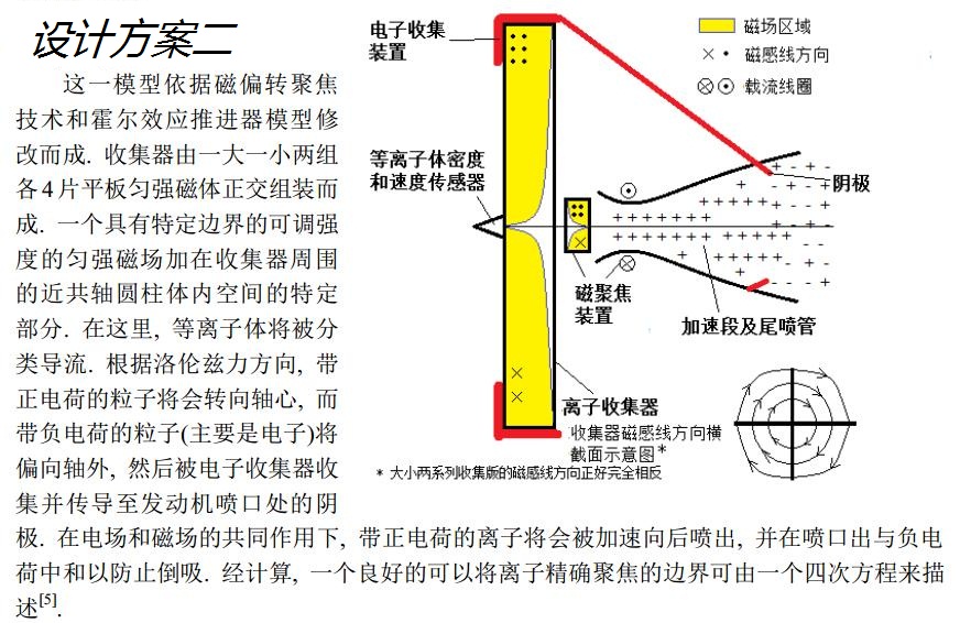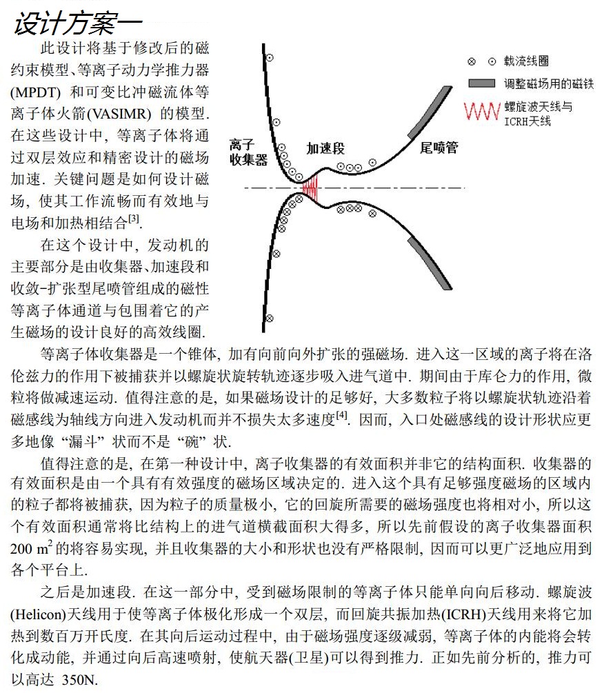 這一事實(shí)讓我想起了使用的離子推進(jìn)器的衛(wèi)星, 如SMART和DAWN衛(wèi)星等. 離子推進(jìn)器的廣泛應(yīng)用說明了人類在短距離小空間內(nèi)加速離子的技術(shù)日臻成熟. 這也同時(shí)讓我考慮到一個(gè)新的模型——融合傳統(tǒng)離子推進(jìn)器和沖壓發(fā)動(dòng)機(jī)的設(shè)計(jì), 讓等離子體代替空氣進(jìn)入進(jìn)氣道, 然后使用電場(chǎng)和磁場(chǎng)來(lái)加速, 以取代化學(xué)燃料的燃燒. 這就是我的想法的概述.