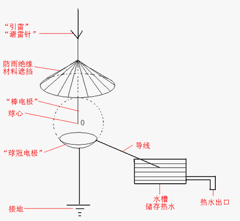 如圖7,可以在“雷擊村”,或其他發生“閃電”較多的區域,并且遠離居民區的地方,放置一些大大小小的“棒電極——球冠電極”。“棒電極”樹立于空中,用于招引閃電,類似于“避雷針”,但必須與其接地的支撐物絕緣,并且深入到“球冠電極”球心的頂端部位,越細越好——越細激發的“球狀閃電”的能量越大。“球冠電極”的頂端接地,在其邊沿接一導線引入水槽,在閃電放電時,產生的“球狀閃電”可以沿導線進入水槽,“球狀閃電”所含的部分能量——熱能可以加熱水,這樣“閃電”的能量,就可以通過“接轉”為“球狀閃電”,再把可以“暫時儲存能量”的“球狀閃電”的部分能量——熱能傳給水,人們就可以利用熱水用于工業生產或日常生活了。