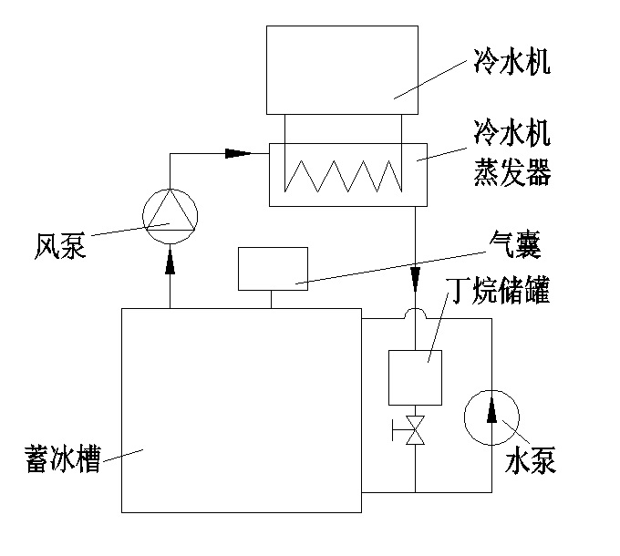丁烷冰漿采用了簡單高效的理念,采用冷水機組、風泵、水泵等通用高效設備,流程簡單,控制容易,維護方便,氣態(tài)丁烷通過風泵加壓進入冷水機蒸發(fā)器,通過氣液相變高效換熱冷凝,液態(tài)丁烷和水一起進入水泵,再與水直接接觸再蒸發(fā)為氣態(tài)進行高效熱交換,水放出相變熱變?yōu)楸ち枋奖梢员盟停鶟{流入蓄冰槽,氣態(tài)丁烷進入風泵不斷循環(huán);氣囊接通循環(huán)系統(tǒng),使系統(tǒng)既封閉又自動保持常壓(大氣壓力);冷水機蒸發(fā)器中丁烷溫度控制在20C左右(風壓約10kpa);蓄冰槽中氣態(tài)丁烷蒸發(fā)溫度在-0.50C左右(氣壓約0kpa),蓄冰槽中冰水混合溫度在00C。丁烷冰漿技術綜合能效比可達4.0,尤其投資省,可低于常規(guī)冷水機組空調投資,而且省電費更多可達40-70%。丁烷冰漿缺點是丁烷易燃易爆,有安全性要求,由于是密閉系統(tǒng)、充填量小(僅約30g/kw)、強制通風且系統(tǒng)壓力低(僅0-10kpa),丁烷不易泄露,采用安全防范措施,嚴格按安全規(guī)程操作,丁烷冰漿明顯比氨制冷系統(tǒng)風險小,也比燃氣熱水器/廚房煤氣風險低。