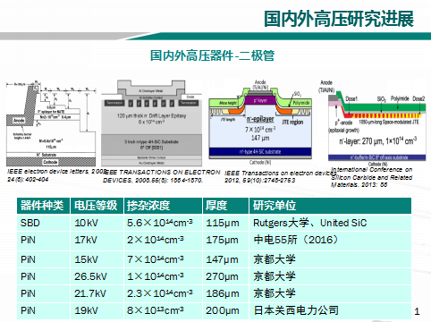雖然在低壓領域SiC已經進入產業。但是在高壓領域,不管是國內還是國外都還處于研發階段。由于材料的優勢,國外的研發進度要領先一些,日本京都大學在3年前就研發了26.5kV的PiN二極管,美國的Cree公司在也在3年前就研發了20.7kV的IGBT。國內在引進先進的厚膜外延設備后,厚膜外延材料制備技術得到進步,最近也在高壓器件方面做了一些成績,比如中電55所在2016年報道了17kV 的PiN二極管,在2018年報道了12kV 的IGBT,說明國內材料在一步步進度,器件的差距也和國外漸漸縮小。