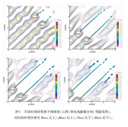 下面看一下相交微波束大氣擊穿的模擬結果,我們首先算了同頻率微波相交的情況,此時相干疊加之后,由于干涉作用,會形成電場強度強弱分布。我們首先模擬一下種子電子在弱場區的情況。因為在大氣中種子電子是偶然出現的,有可能出現弱場區,如果出現在弱場區,它需要擴散,擴散到強場區之后電子碰撞分子發生雪崩電離,形成的等離子體沿著強場區做趨源運動,運動方向沿著)=:的這條線。形成的等離子體的區域是一個等離子體絲帶,當然如果把氣壓降低,會發現絲帶就會過渡為一個等離子體帶。圖1給了幾個典型時刻的等離子體密度分布和場強的分布,在20ns的時候,由于靠近等離子體區域最強的場是沿著)=:這條線的,當等離子體絲帶長度增加到一定程度的時候,在其左上和右下區域,相當于把兩個微波場隔開,這兩個區域相當于只有一個單微波的作用,在兩邊有新的等離子體絲帶。如果初始電子出現在強場區,電子碰撞分子就會雪崩電離,形成等離子體。等離子體區域也是沿著J=:這條線做趨源運動。下面簡單比較了同頻和非同頻微波相交的大氣擊穿,同頻相當于相干疊加,非同頻相當于非相干疊加,模擬時間都是80ns,初始的種子電子數都一樣,可以發現在相干的情況下,即使把種子電子源放到場強最小的地方,產生等離子體的區域也大于非相干的情況,而且產生的最大電子數也是大于非相干的情況??偨Y主要有三點,一個是區域隨壓強的變化,還有等離子體做趨源運動,還有相干比非相干的等離子體區域比較大。