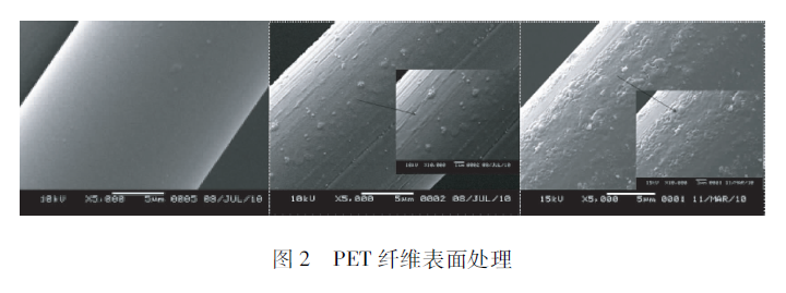 用長50cm、間距5cm的電極板做了一個射頻的放電模式。我們用上面介紹的JET做了滅菌實驗,細菌的存活數量得到了有效的下降。在這里主要看一下對化纖的處理效果,圖2的左圖是沒有處理過的,中圖是200 W處理的,右圖是800 W處理的。這兩個之間有什么區別呢?中圖顯示纖維表面有溝槽出來,這任何化纖在等離子體處理情況下刻蝕的一個特征,在低真空情況下的射頻放電都會有溝槽刻蝕出來。但是在大氣壓輝光放電的情況下,表面有許多圓形體產生。我認為不單純有刻蝕,而且有表面熔融的狀態出來。所以說,在大氣壓射頻放電對表面的作用是相當強的。雖然每個脈沖時間比較短,但是它的作用非常強。